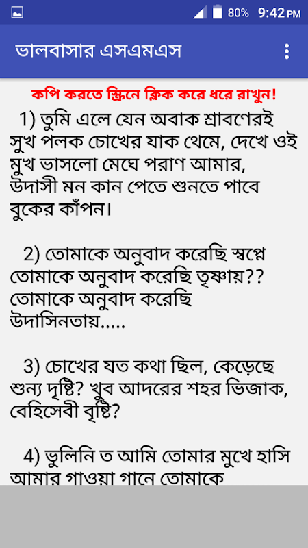 This is a New Bangla Text SMS Messaging Application. Through this app you can Copy and send Bangla Text SMS Message with your friends and family. This application based on Bengali interface. You can Copy and Share all of the messages within your social media.