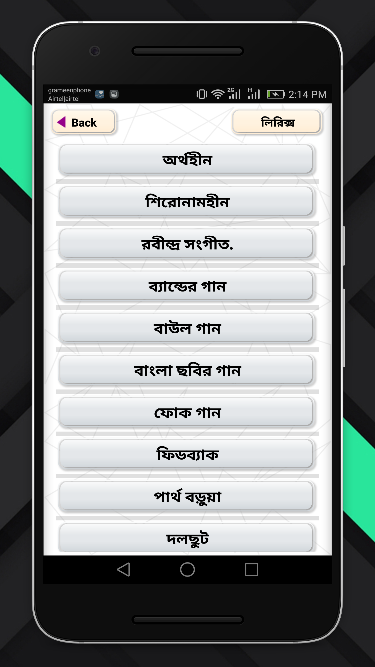 Our Bangla Song Songwriter App has been arranged with popular Bangla Song Lyrics. An alternative to the Bengali song book, this is the book of our Bengali song app. You can download this app fromBangla Song and you can give beautiful Bengali songs to your friends on Facebook or write a letter to your friends. The lyrics of Bengali songs are very popular among us.