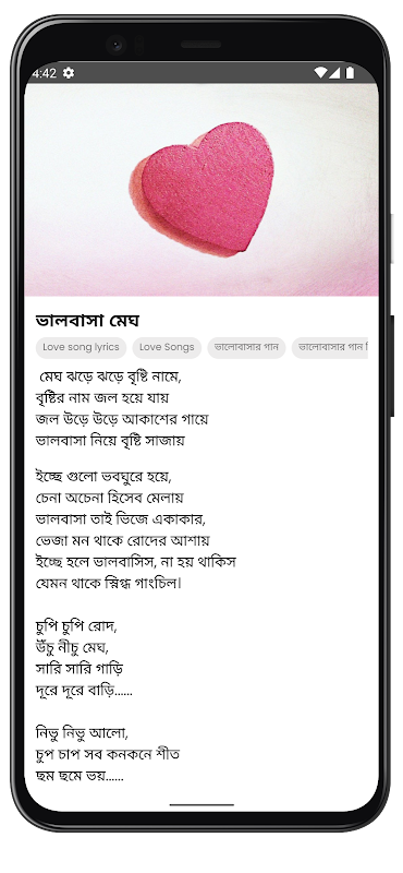 "ভালোবাসা'- এক শব্দের মিষ্টি অভিব্যক্তি. এত সুন্দর আর কোনো শব্দ বোধহয় অভিধানে খুঁজে পাওয়া যাবে না. আর ভালোবাসার সেই মিষ্টি মধুর সময়ে প্রেমিক-প্রেমিকার অনুভূতি নিয়ে যুগে যুগে জন্ম নিয়েছে শত শত গীতিকবিতা. আমাদের বাংলা গানের সুরের ভুবনেও ভালোবাসা এক অনন্য বিষয়বস্তু. বহুগুণী শিল্পীর কাছ থেকে আমরা সময়ে সময়ে পেয়েছি ভালোবাসার গান. পাঠক-পাঠিকাদের মনের আঙিনায় মুঠো মুঠো ভালোবাসা ছড়িয়ে দেওয়ার জন্য আমরা বিভিন্ন সময়ের 100 টি জনপ্রিয় ভালোবাসার গান নির্বাচন করেছি. মোট 10 ক্যাটাগরিতে ভাগ করে আমরা গান গুলো সাজিয়েছি. যেসব ক্যাটাগরি গান আপনি এই অ্যাপে পাবেন-
