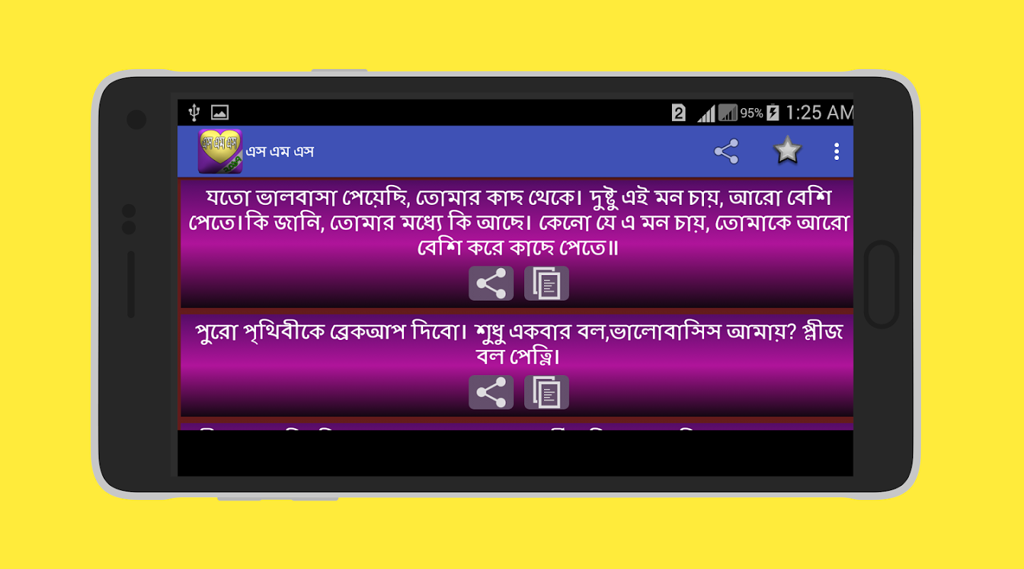 ভালোবাসার মানুষ কে খুশি রাখতে প্রয়োজন হয় কবিতা অথবা এসএমএস আর এই এস এম এস সবাই সাজিয়ে লিখতেও পারেন না। তাহলে কি করবেন? চিন্তা নেই আমরা আপনাদের জন্য নিয়ে এলাম ভালবাসার এস এম এস আপনি শুধু পড়বেন আর যেটা পছন্দ সেটা ক্লিক করে পাঠিয়ে দিবেন আপনার প্রিয় মানুষ কে। এর জন্য আমরা ভালোবাসার মেসেজ অ্যাপ টি তে রেখেছি sms কপি ও সরাসরি সেন্ড করার অপশেন।