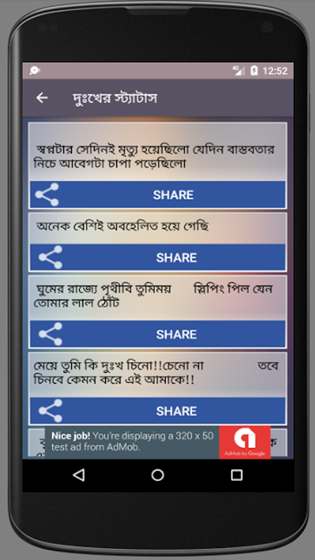 আশা করি এই বাংলা ফেসবুক স্ট্যাটাস (status dla fb) অ্যাপটি আপনাদের ভাল লাগবে। অ্যাপটি ভাল লেগে থাকলে আপনার বন্ধুদের সাথে শেয়ার করুন আর আপনার ভাললাগা আমাদেরকে রিভিও করে জানিয়ে দেন। কোন পরামর্শ থাকলে ই-মেইল করতে পারেন। jeśli podoba ci się status na Facebooku bangla, oceń nas 5 gwiazdkami