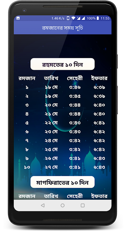 ৬৪ টি জিলার সেহরী ও ইফতারের সময়সূচী আলাদা আলাদা ভাবে বিভাগ অনুযায়ী পাবার জন্য আজই ডাউনলোড করুন এই অ্যাপটি। রমজান ক্যালেন্ডার ২০১৮ নিয়ে আমাদের এই অ্যাপ । আসন্ন রোজাকে ( ramadan calendar 2018 ) সামনে রেখে এই অ্যাপটিকে আপনাদের সামনে তুলে আনা হয়েছে । এই অ্যাপটি ব্যবহার করে আপনি ইফতারের সময়সূচী থেকে শুরু করে সেহরির সময়সূচী সম্পর্কে জানতে পারবেন । রমজান ক্যালেন্ডার ২০১৮ নিয়ে আমাদের এই অ্যাপটি। রমজান ক্যালেন্ডার ২০১৮ অ্যাপটিতে আপনারা রমজানের সময়সূচী ও ইফতার ও সেহেরীর সময়সূচী আরো সাথে থাকছে রমজান মাসের গুরুক্ত পূর্ন কিছু আমল। যা আমাদের সকলের জন্য খুবই উপকারী । রমজান ২০১৮ বয়ে আনুক আমাদের জন্য ক্যালনকর একটি মাস। রমজান ২০১৮ হয়ে উঠুক আমাদের পাপ মোচন করার মাস।