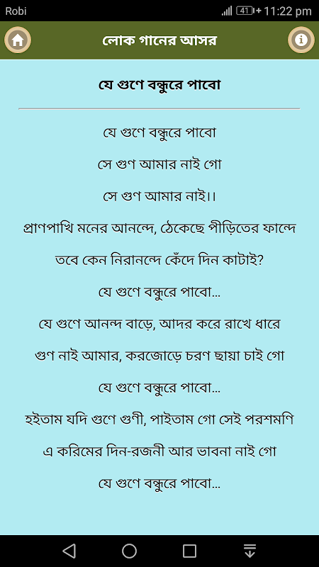 আমরা সকলেই শুধু গান শুনতেই ভালোবাসি না বরং গান গাইতেও আমাদের কাছে ভালো লাগে। একটি গান সম্পূর্ণভাবে গাওয়ার জন্য তাঁর লিরিক্স জানা দরকার। বাংলা গানের লিরিক্স অ্যাপ এ আমরা সাড়াজাগানো সকল বাংলা গানের লিরিক্স একসাথে করেছি যা দেখে আপনি আপনার ভাললাগার এবং ভালোবাসার গান নিজের মতকরে গাইতে পারবেন। গান গাইতে ভালোবাসে না এমন কোন মানুষই খুঁজে পাওয়া যাবে না কিন্তু সঠিক গানের লিরিক্স না জানা থাকার কারনে অনেকেই ইচ্ছে থাকার পরেও গান গাইতে পারে না তাই তাঁদের জন্য আমাদের এই অ্যাপ একটি উত্তম সমাধান।