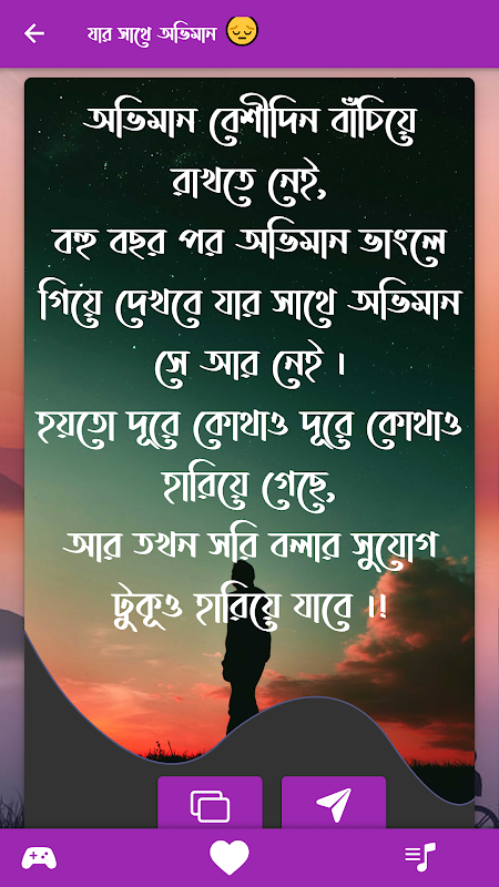 Tài Xỉu অভিমানী আবেগী কষ্ট ভুলে মনের মানুষকে ❤️ কাছে আনার জন্য মেসেজ স্ট্যাটাস নিয়মিত শেয়ার করতে করতে ারবেন। Romantyczna wiadomość Shayari দিয়ে মনের মানুষের রাগ ভাঙ্গিয়ে 🥰 কাছে আনত ে পারবেন। হঠাৎ অভিমানী কষ্ট আমাদের জীবনে মাঝে মধ্যেই আস ে। কারণ জীবন্টা বড় কষ্টের। এরকম সিচুয়েশনে মোটিভেশনাল ❤️ মেসেজ আর উক্তি আম াদের ভাঙ্গা হৃদয়কে জোড়া লাগাতে সাহায্য করে। বাংলা কষ্টের স্ট্যাটাস ও এসএমএস আপনার কষ্টের সময়ে আপনাকে মোটিভেটেড রাখবে। ভাঙ্গা হৃদয় ও উপদেশমূলক এসএমএস নিয়মিত মনকে উৎসাহ দিবে। ছবিসহ স্ট্যাটাস এসএমএস গুলো কষ্ট ভুলিয়ে মনকে মোটিভেশন দেয়।