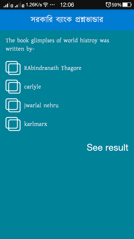 This app has been developed with previous years question of govt bank examination question and answer . This app contains 2500 more mcq . This app contains 4 screens . First screen contains year number list . Second screen contains mcq , By sliding user will find next screen . User can select any question by typing question number . In third screen, there is option for examination with flash card