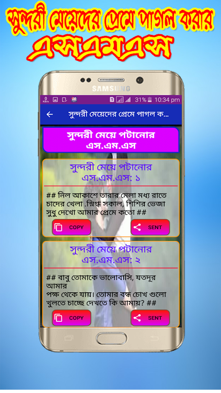 আমাদের এই অ্যাপটিতে সুন্দরী মেয়েদের প্রেমে পটানোর সকল ধরনের এসএমএস অর্ন্তভুক্ত করা হয়েছে। আমরা অনেকেই মেয়েদের সাথে কথা বলতে ভয় পাই এবং কোন সময় কোন কথাটি বলবো তাও বুঝতে পারি না। আমি তাদের উদেশ্যই বলতেছি আমাদের অ্যাপটির মাধ্যমে আপনার সেই পছন্দের মেয়েটিকে মজার মজার হাসির এবং মিষ্টি মধুর প্রেমের রোমান্টিক এসএমএস গুলো পাঠান। এরপর মাত্র কয়েকদিনে দেখুন আপনার পছন্দের মেয়েটি আপনাকে ভালোবাসতে শুরু করে দিবে। একটি কথা মনে রাখবেন মেয়েরা সেই ছেলেদেরকেই বেশি পছন্দ করে যে ছেলেরা মেয়েদের বেশি পরিমানে হাসাতে পারে।