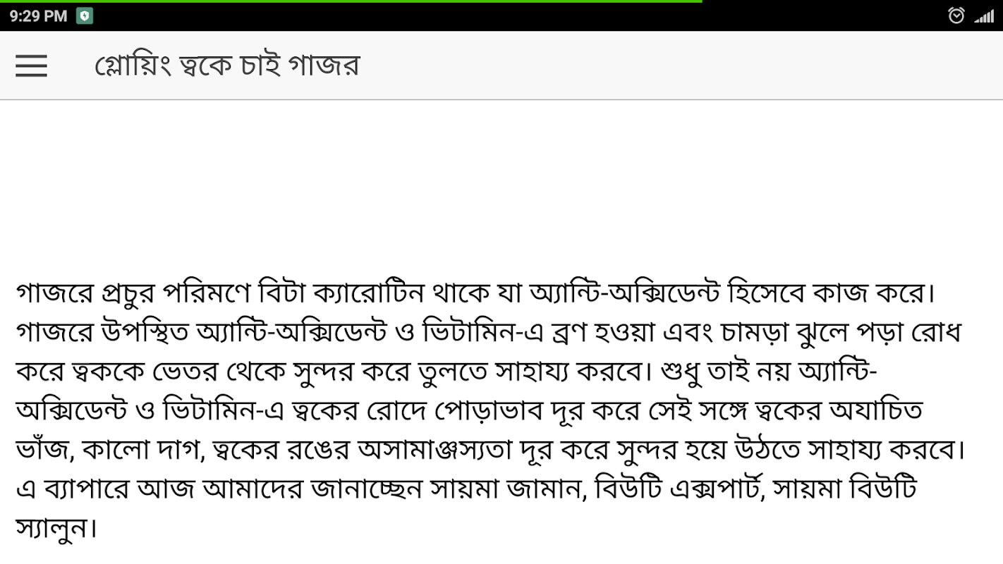 গাজরে প্রচুর পরিমণে বিটা ক্যারোটিন থাকে যা অ্যান্টি-অক্সিডেন্ট হিসেবে কাজ করে। গাজরে উপস্থিত অ্যান্টি-অক্সিডেন্ট ও ভিটামিন-এ ব্রণ হওয়া এবং চামড়া ঝুলে পড়া রোধ করে ত্বককে ভেতর থেকে সুন্দর করে তুলতে সাহায্য করবে। শুধু তাই নয় অ্যান্টি-অক্সিডেন্ট ও ভিটামিন-এ ত্বকের রোদে পোড়াভাব দূর করে সেই সঙ্গে ত্বকের অযাচিত ভাঁজ, কালো দাগ, ত্বকের রঙের অসামাঞ্জস্যতা দূর করে সুন্দর হয়ে উঠতে সাহায্য করবে। এ ব্যাপারে আজ আমাদের জানাচ্ছেন সায়মা জামান, বিউটি এক্সপার্ট, সায়মা বিউটি স্যালুন।