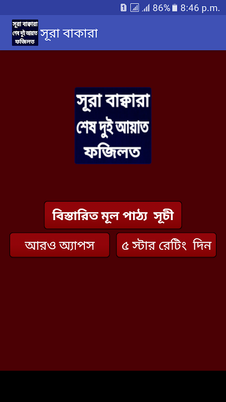সূরা বাকারা এটা কুরআনের দ্বিতীয় সূরা। সবচেয়ে বড় ও গুরুত্বপূর্ণ একটি সূরা যা মদিনায় অবতীর্ণ। এতে মোট ২৮৬টি আয়াত আছে।এ সূরার শেষ দুই আয়াত অর্থাৎ ২৮৫ ও ২৮৬ নম্বর আয়াতের গুরুত্ব ফজিলত অনেক বেশি।আরবি আয়াত সহ সরল ও সাবলীল ভাষায় বাংলা উচ্চারণ সহ তুলে ধরা হয়েছে।এ ইসলামিক অ্যাপটি আপনি আরও পাবেন সূরা বাকারা এর ফজিলত ও কিভাবে আমল করবেন তার সম্পর্কে ধারণা।