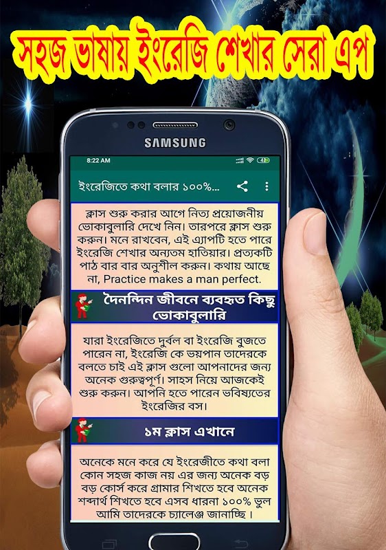 ইংরেজি শেখার অন্যতম সেরা এপ্। ইংরেজিতে কথা বলার জন্য কোন গ্রামারের প্রয়োজন হয় না, আর তাতে যদি আপনার কোন সন্দেহ থাকে তাহলে ভাল মানের একজন ইংলিশ স্যারের সাথে কথা বলে নিশ্চিত হয়ে নিন।যাদের ইংরেজির বেসিক দুর্বল বা ইংরেজি বুজতে পারেন না, ইংরেজি কে ভয়পান তাদেরকে বলতে চাই এই ক্লাস গুলো আপনাদের জন্য অনেক গুরুত্বপূর্ণ। সাহস নিয়ে আজকেই শুরু করুন। আপনি হতে পারেন ভবিষ্যতের ইংরেজির বস।