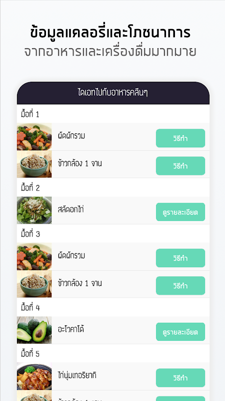 Oprócz śledzenia jedzenia i kalorii, dziennik kalorii może pomóc w ustalaniu dziennego spożycia kalorii na podstawie danych i sylwetki, dzięki czemu możesz osiągnąć docelową wagę. Możesz znaleźć zawartość kalorii i wartość odżywczą produktów spożywczych, takich jak białko, tłuszcz, sód, cholesterol, w wielu tajskich i międzynarodowych produktach spożywczych i napojach, które przygotowała dla Ciebie aplikacja.