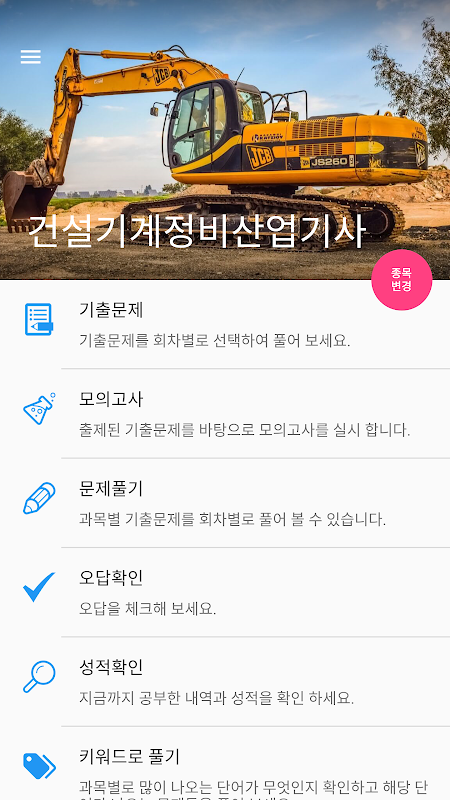 건설기계정비산업기사 공부를 위한 필수 앱 입니다.건설기계정비내연기관유압기기 및 건설기계안전관리일반기계공학 등 과목별로 공부 해 보세요.
