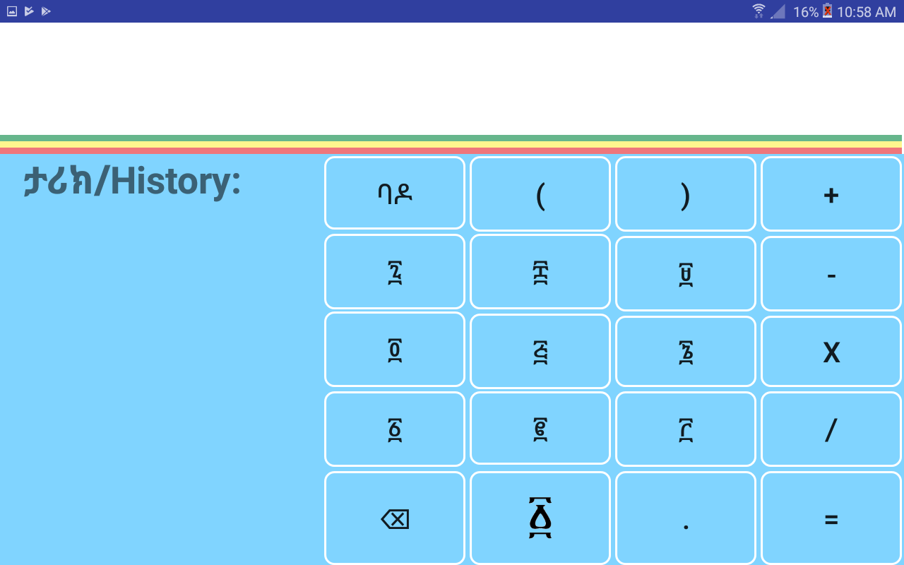 ይህ የሂሳብ ማስሊያ (ካልኩሌተር) በገጹም ሆነ በይዘቱ ኢትዮጵያዊነት የተላበሰ እና ለመሰረታዊ የሂሳብ ስሌት ስራ እንከን የለሽ አገልግሎት ይሰጣል። በተጨማሪም ይህ የስልክ-ቁስ (አፕ)፦