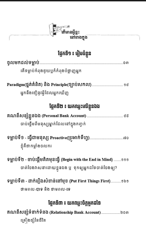 - ឈ្មោះសៀវភៅ : ទម្លាប់ 7 យ៉ាងដ៏មានប្រសិទ្ធភាពសម្រាប់យុវវ័យ