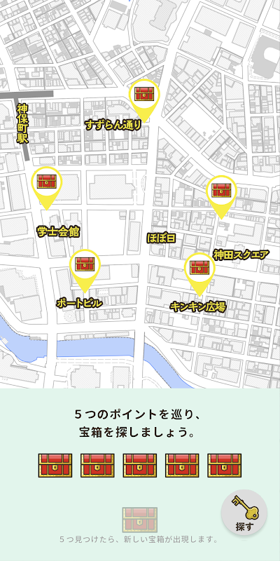 „Osanpo Treasure Hunt” to gra, w której faktycznie chodzisz po mieście i szukasz skrzyń ze skarbami. Kiedy patrzysz na scenerię miasta przez kamerę aplikacji, na ekranie pojawia się skrzynia skarbów. Znajdź wszystkie skrzynie ze skarbami i zaprzyjaźnij się z miastem!