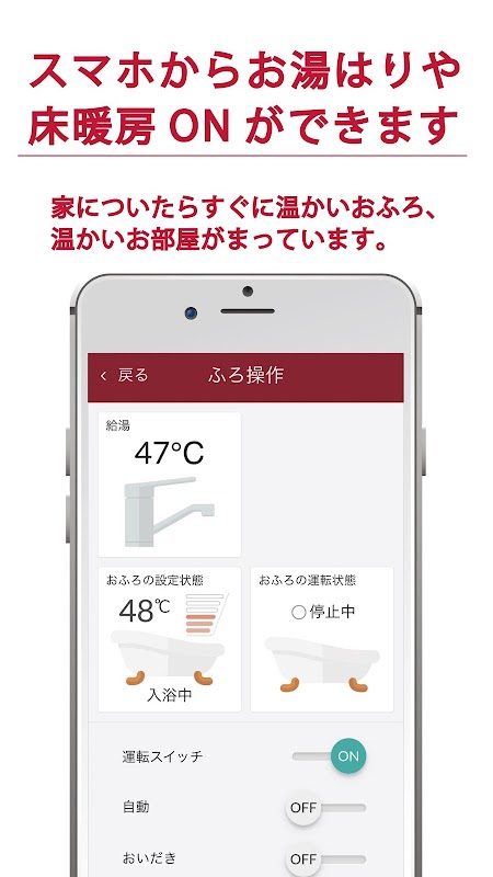 ・外出先からおふろのお湯張り・おいだき操作ができます。家についたらすぐに温かいおふろに入れます。
