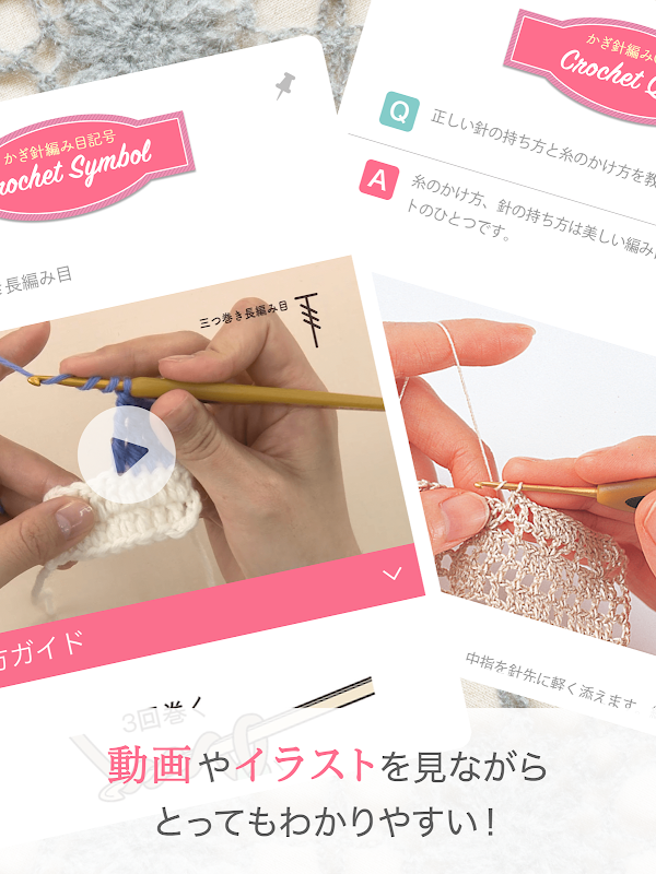 Wyjaśnia, jak robić na drutach symbole ściegów szydełkowych z łatwymi do zrozumienia ilustracjami. Obejmuje wszystko, od symboli ogólnego dziania cienkiego i długiego po trudne symbole, takie jak ściegi w kształcie litery Y i odwrotne ściegi w kształcie litery Y. Wyjaśnia również dzianie koralików i dzianie sznurkiem.