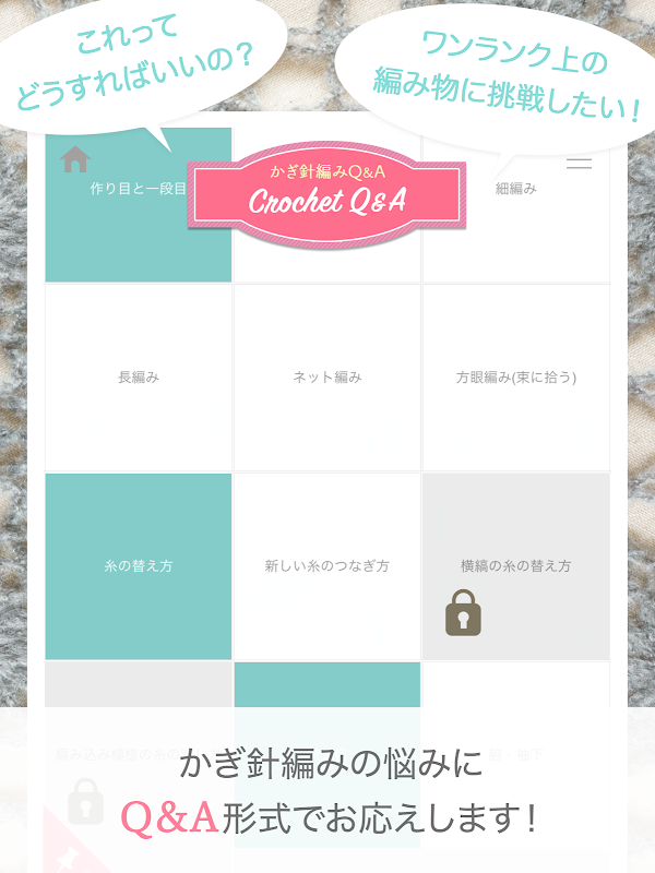 Dzięki dwóm głównym tematom, wzorom podłoża i motywom łączącym, techniki szydełkowania i wykańczania są zilustrowane w łatwym do zrozumienia formacie pytań. Składa się z pytań i odpowiedzi zgodnych z treścią księgi stylów odzieży. Jest to aplikacja pomocy dla tych, którzy znaleźli sweter, który im się spodobał i zaczęli robić na drutach, ale poddali się w połowie, ponieważ nie wiedzieli, jak robić na drutach, lub dla tych, którzy nie mają nikogo w pobliżu, kto mógłby ich nauczyć.