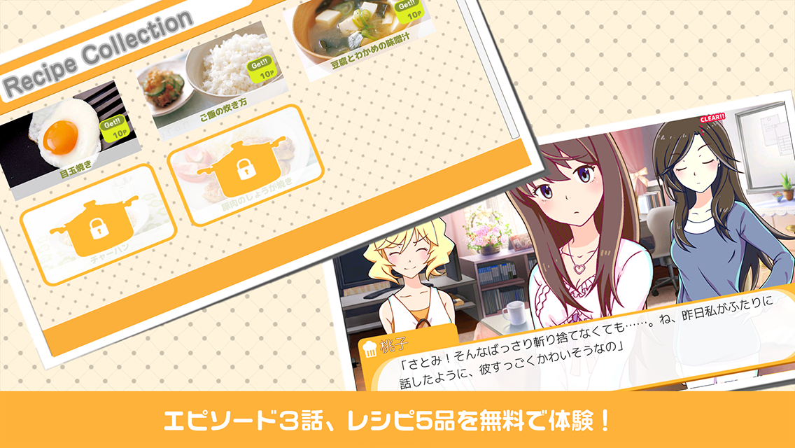 幼少の頃両親が離婚し、心の傷が癒えないままの主人公。彼の目標はごくありふれた暖かい幸せな家庭を築くこと。主人公は、夢を実現させるために自らおいしい料理を作れるようになるのだと心に決めていた。高校を卒業し大学に進学した主人公は母親の元を離れ、念願の一人暮らしを始めた。ようやく自宅のキッチンで料理を作れる環境を手に入れたものの、腕は一向に上達せず途方に暮れていた。そんな時、主人公の友人、坂本から大学に料理研究会というサークルがあることを教えてもらう。サークルには三人の美少女が在籍しており、苦労の末入会させてもらえることに。