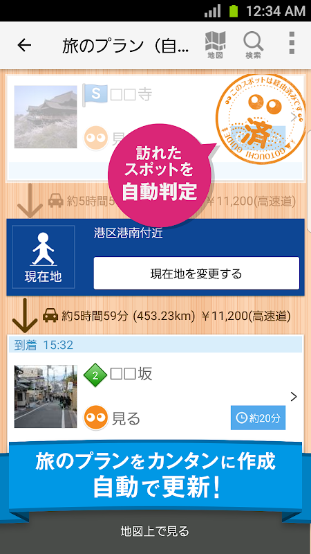 訪れたスポットを自動判断して、現在地や訪れたスポットは旅のプラン上で自動更新!