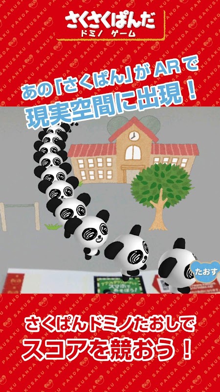 「さくさくぱんだドミノゲーム」は、人気のチョコレート菓子『さくさくぱんだ』のキャラクターである「さくぱん」が登場するゲームアプリです。AR(拡張現実)機能により現実空間に現れた「さくぱん」を並べてドミノたおしを行い、そのスコアを競うお子様から大人まで遊べる内容です。