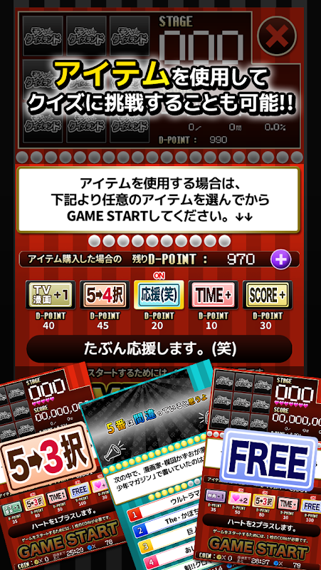 ハートを増やす、制限時間を伸ばす、5択を3択にする等、様々なアイテムが用意されていますので、御利用ください。