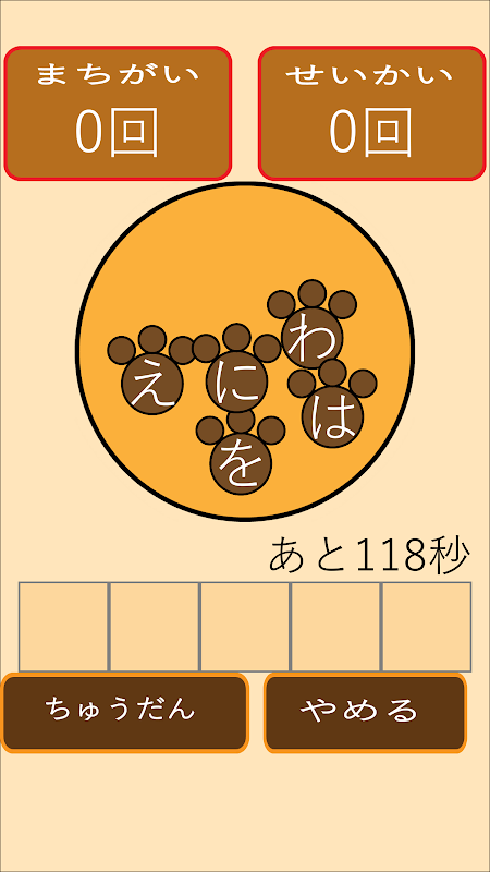 Uzyskaj jak najwięcej poprawnych odpowiedzi, układając pięć znaków hiragana w ciągu dwóch minut!