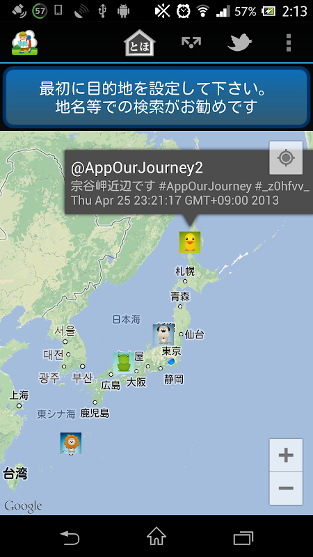 Twitterのアカウントがあれば、他の旅人のつぶやきを、地図に表示することができます。