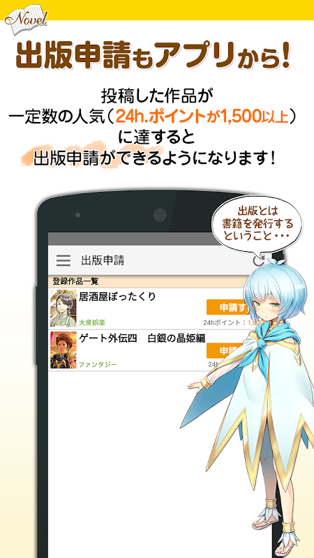 投稿した作品が一定数の人気(24h.ポイントが1,500以上)に達すると出版申請ができるようになります!