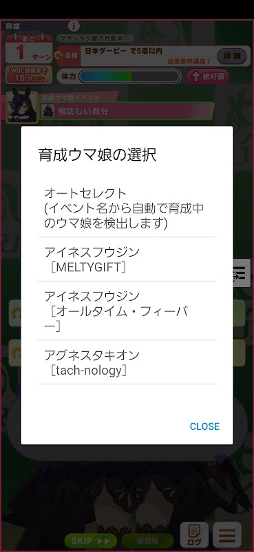 Warcab, który może wyświetlać efekty opcji wydarzenia Uma Musume na ekranie gry.