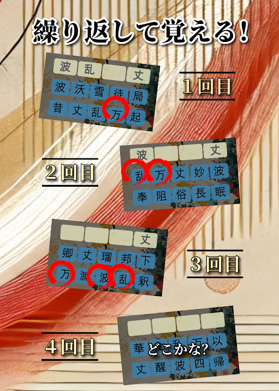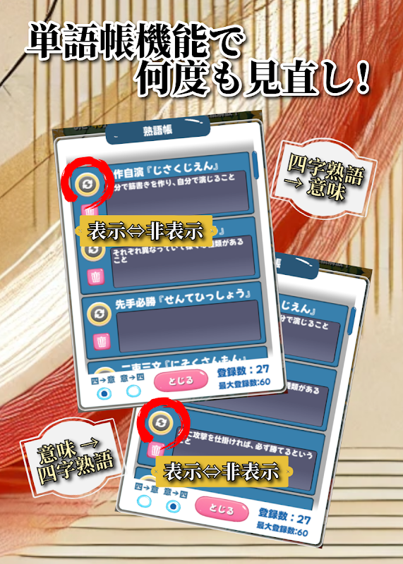 Idealny dla tych, którzy chcą cieszyć się czteroznakowymi idiomami/kanji w sposób podobny do gry i tych, którzy chcą efektywnie się uczyć!