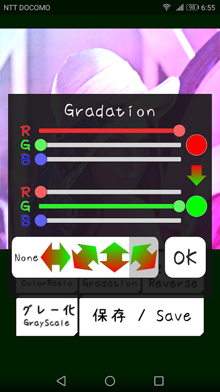 スマホ内の画像の色を自由に変更するアプリです。 三原色の割合を変更、グラデーションの追加、色の反転やグレースケール変更ができます。