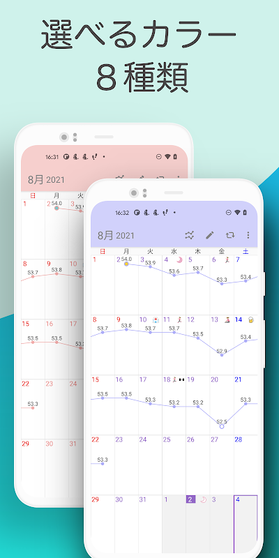 Zapisując na ekranie kalendarza, możesz łatwo zarządzać swoją wagą za pomocą wykresów i stempli.