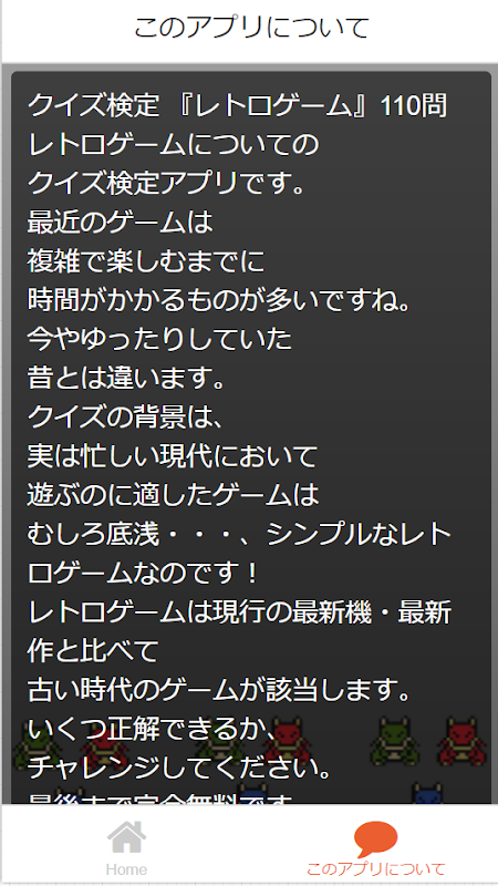 レトロゲームについてのクイズ検定アプリです。最近のゲームは複雑で楽しむまでに時間がかかるものが多いですね。今やゆったりしていた昔とは違います。