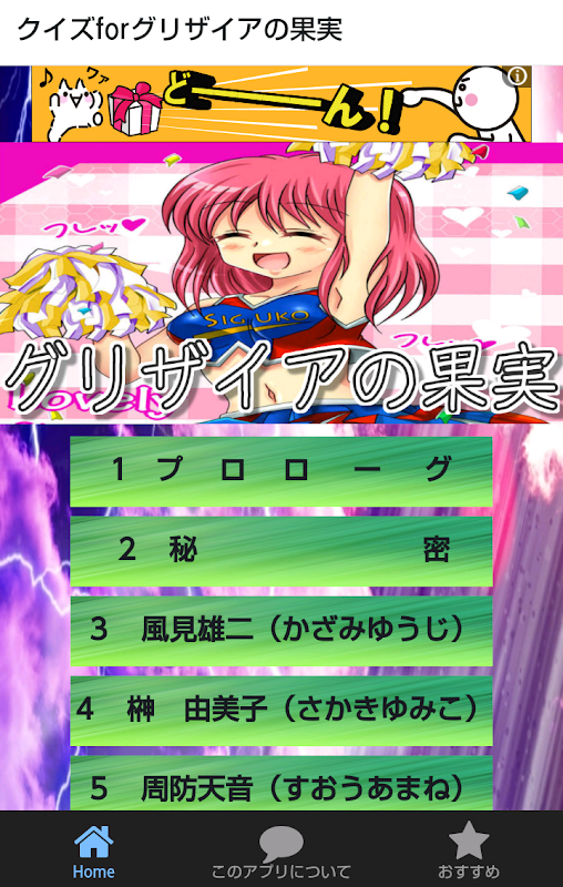 This is a quiz application on the synopsis and character of Japanese anime, "The Fruit of Grisaia".