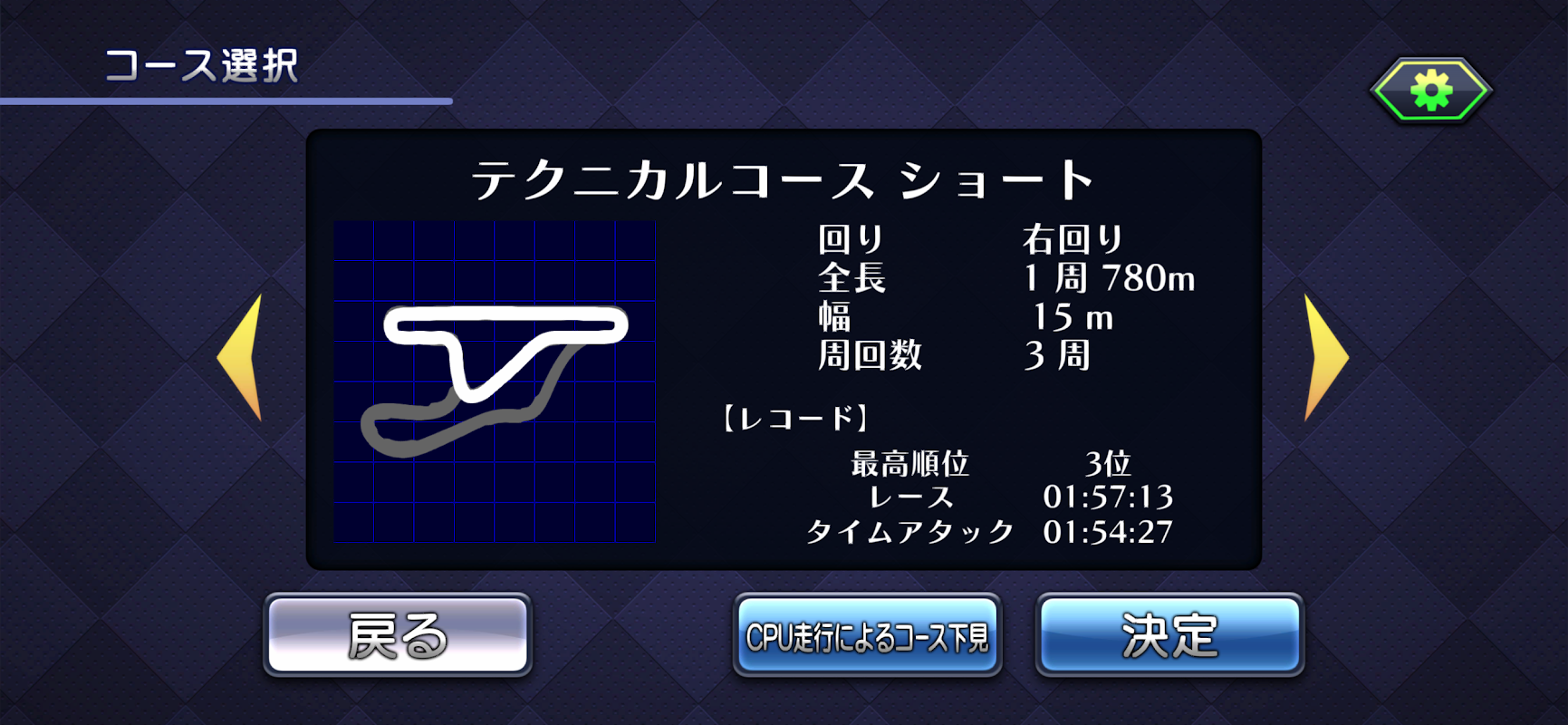 コース選択画面で「CPU走行によるコース下見」を選択すると、選択中の車種でコースの参考プレイを見ることができます。