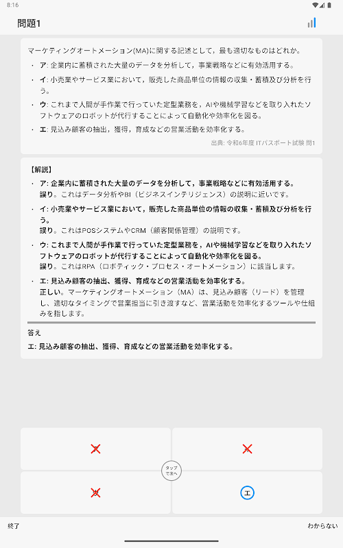 - Szczegółowe wyjaśnienia do wszystkich pytań – Każde pytanie i opcja odpowiedzi mają wyjaśnienie. Nawet trudne terminy informatyczne i słowa katakany są dokładnie wyjaśnione, dzięki czemu możesz pogłębić swoją wiedzę, nawet jeśli uczysz się samodzielnie, bez ryzyka potknięcia. Nawet początkujący mogą uczyć się z przekonaniem i zdobywać potrzebną wiedzę.
