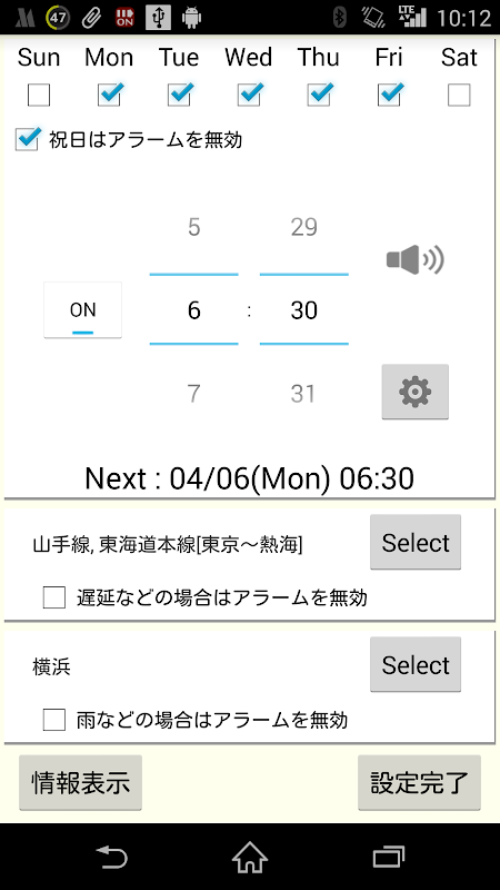 電車の遅延以外にも、天気をチェックし、予報が雨だったら、アラームを鳴らさないようも出来ます。