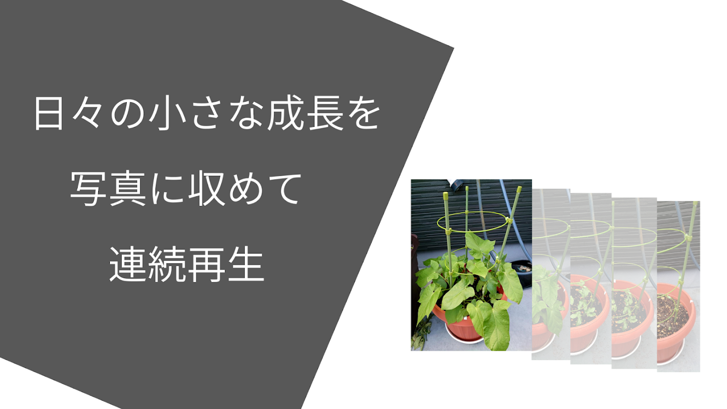 同じアングルから日々の植物の写真を記録し、その写真を連続再生することで植物の成長を確認することができます。この機能を使って、まだ芽のでいない鉢の状態から毎日観察しておけば、植物が成長していく過程を見ることができます。