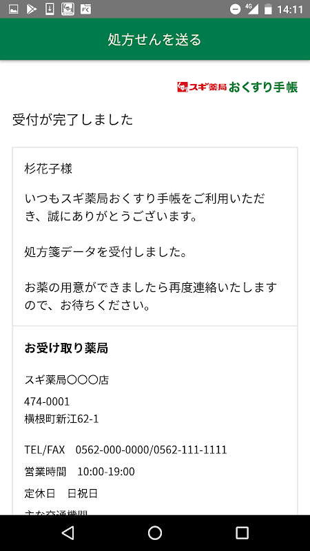また、処方箋の画像データをスギ薬局の店舗に送信することで、事前にお薬の準備を依頼することができます。便利な機能満載の「スギ薬局 おくすり手帳」を是非ご利用ください。