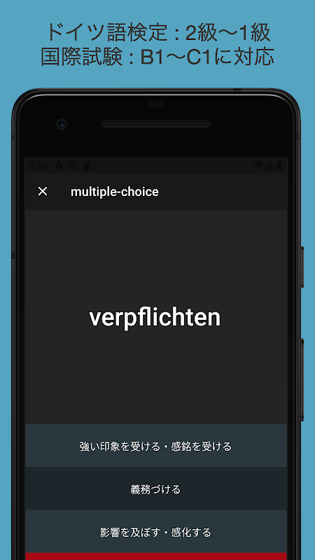 ドイツ人女性によるネイティブ音声を採用。暗記、選択、リスニング、ゲームモード、4機能搭載。約1500語を学習可能。独検2級〜準1級、国際試験B1〜C1に対応。