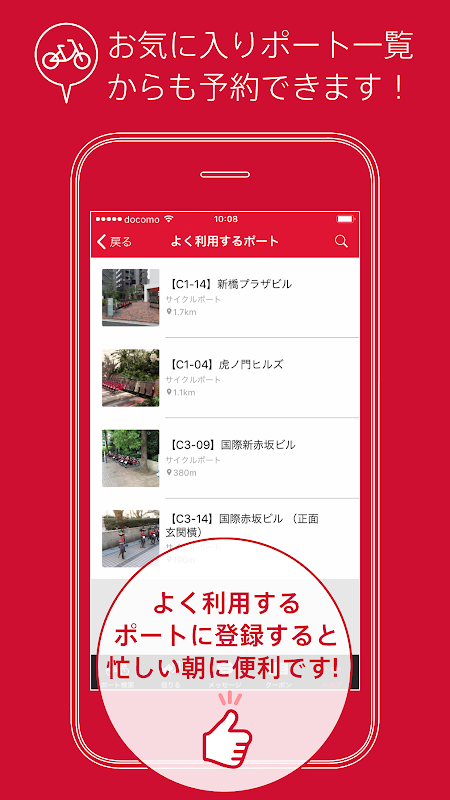 ドコモ・バイクシェアの公式アプリです。最寄のサイクルポート(駐輪場)が検索できるほか、ドコモ・バイクシェアや各サイクルポートからのお知らせが閲覧できます。