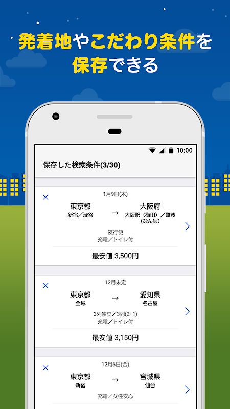 よく使うルートの発着地や設備ほか、お好みの条件を保存できるので、検索のたびに設定する手間が省け、帰省やビジネスユースにも便利です