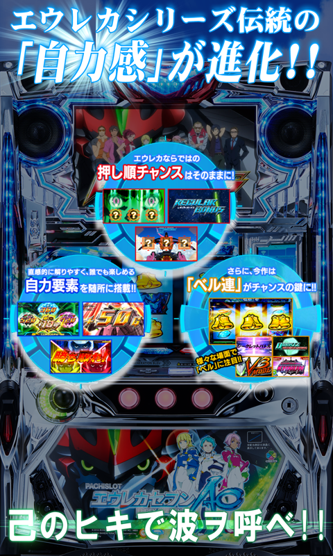 伝統の自力感を進化させた初代エウレカを彷彿させる『押し順当て』などの自力要素のほか、新たにベルが連続するほどチャンスとなる『ベル連』が搭載されるなど、直観的で解りやすく、誰にでも楽しむことのできる機能が随所に搭載されている。