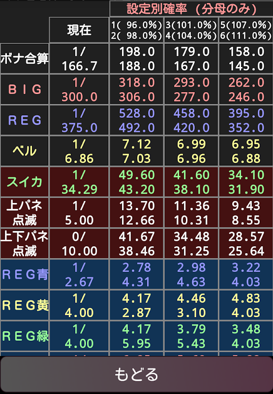 ⑧現在の出現率と各設定の出現率を一覧表示可能