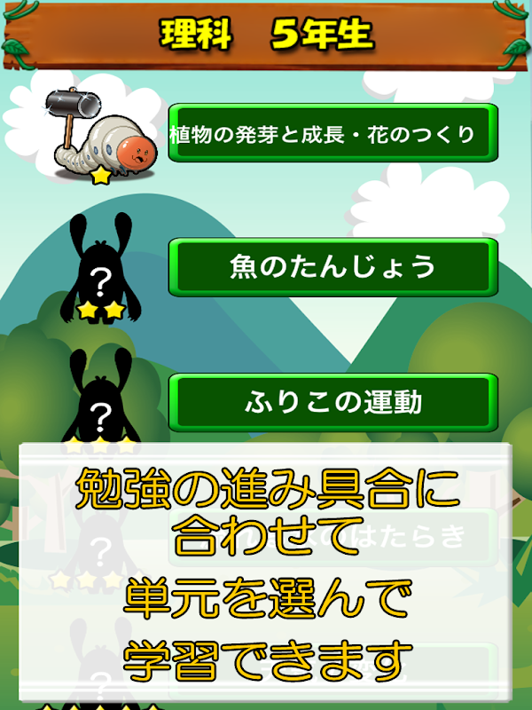 小学校5年生の理科アプリの決定版!学習の進み具合に合わせて単元を選択して、効率的に復習できます。4択のクイズ形式という使いやすさ、勉強のご褒美にモンスターを集めていく楽しさで、子供が継続的に勉強します。