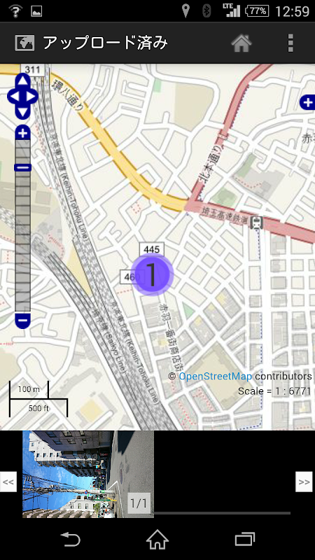 3.チェックボックスにチェックを入れて、右下のアップロードアイコンをタップするとサーバーに送信され、地図上に表示できます。アップロードした写真は下記のURLで地図上に表示されます。