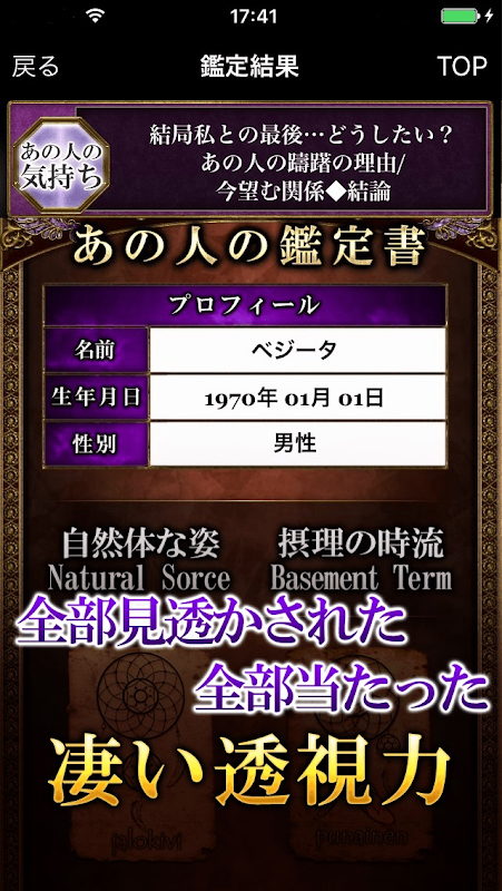 ※一度ご購入された占いも、「違った端末でアプリを再インストールした場合」や、「一度アプリをアンインストールしてから再度インストールし直した場合」には再購入が必要です。こちらご承知下さいませ。
