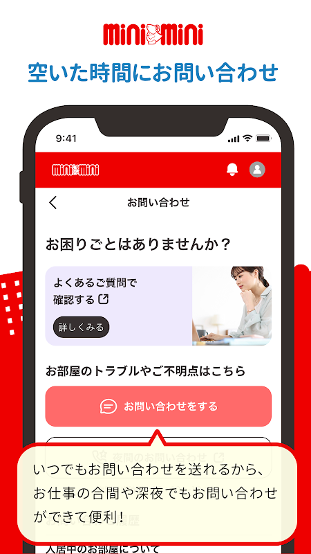 Zapewniamy funkcje wspierające Twoje codzienne życie, takie jak potwierdzanie szczegółów umowy, rejestrowanie zdjęć aktualnych warunków, składanie różnych zapytań, zakup produktów ze zniżką i składanie wniosków o wyprowadzenie się. Konsultacje dotyczące relokacji są również dostępne z poziomu aplikacji do minimini!