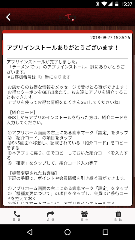 ラーメンてつのアプリをSNSを通じてお友達に紹介する事ができます。
