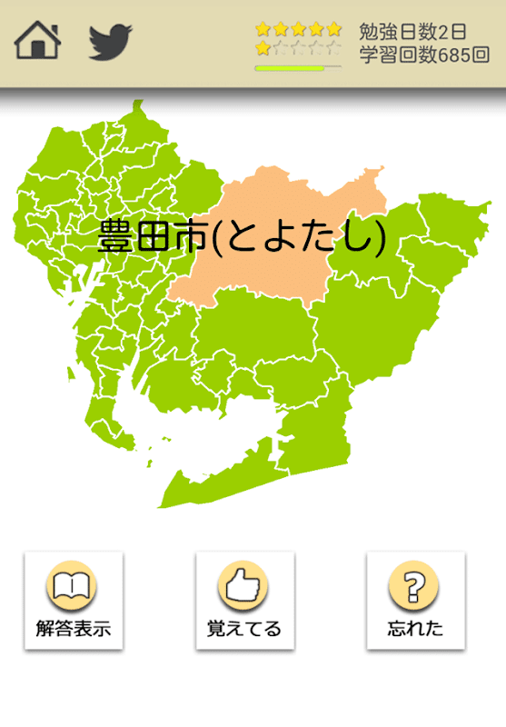 愛知県の市町村、名古屋市の区の地名、位置をゲーム感覚で覚える勉強アプリです。地図上で強調表示される場所を暗記カードのように確認していくことで地図を暗記できます